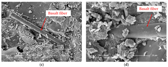 Microstructure of basalt fiber polymer-modified RPC: (a) Interfacial transition zone between quartz sand and cement matrix; (b) Dense C–S–H matrix; (c) Basalt fiber 400×; (d) Basalt fiber 1600×.