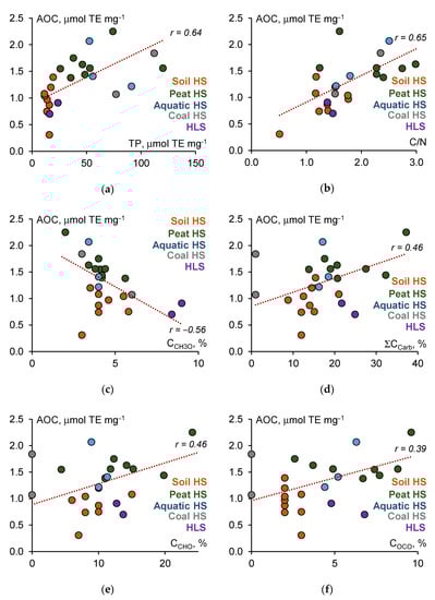 Significant correlations were found between the AOC values and structural characteristics of HS such as TP, C/N, CCH3O, ΣCCarb, CCHO, and COCO (Figure 2). The relationship between AOC and TP can be explained by the fact that a formal H atom donation from weak X–H bonds (where X = O, N, or S) is the major mechanism of peroxyl radical quenching. This mechanism relies on the ability of certain antioxidants (chain-breaking antioxidants) to donate H atoms to ROO• []. This mechanism of action occurs for phenols and antioxidant compounds structurally related to phenols, such as aromatic amines, phenothiazines, pyridinols, pyrimidinols, and thiols [].