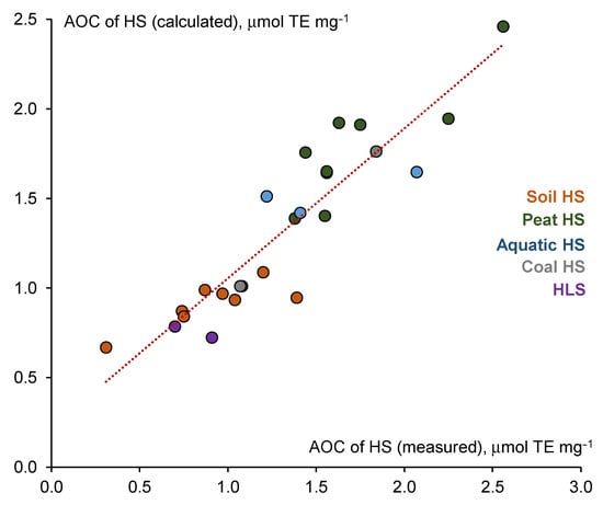 Relationship between measured and calculated AOC values of studied HS using a developed forward stepwise multiple linear regression model.