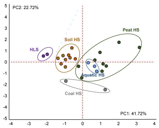 Figure 4 shows the PCA results, with 64.44% of the total variance explained by the properties determining the AOC of HS against hydroxyl radicals. The samples from the different natural sources built distinct clusters, except for aquatic HS. These HS were isolated from HLS, soil HS, and coal HS, but formed a group with peat HS. The latter most likely resulted from the fact that the Suwannee River, which was a source for the aquatic samples in this work, is a blackwater river rising in the Okefenokee Swamp []. The HLS were clustered and different from coal HS and aquatic HS in PC1 (41.72%) because of the high content of methoxyl carbon CCH3O derived from lignin. Aquatic and coal HS were clustered with negative values because of the high C/N values. Soil HS were clustered from peat HS in PC2 (22.72%) due to the lower content of О-substituted methine groups CCHO.