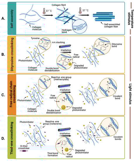 Hydrogel crosslinking upon thermal and light stimuli. (A) Self-assembly of collagen molecules upon thermal stimulus. (B) Photo-induced crosslinking between tyrosine residues, (C) methacryloyl, or (D) norbornene moieties (Created with BioRender.com).