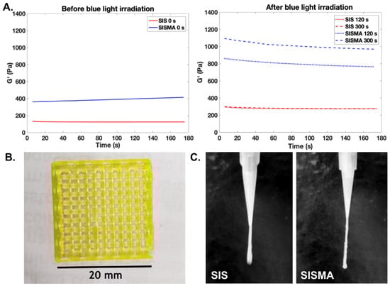 Direct biochemical modifications to dECM hydrogels have also been conducted. For instance, Ali and colleagues successfully bioprinted a bioink based on methacryloyl-modified kidney dECM (KdECMMA) and mixed with HA, glycerol, and gelatin []. The storage modulus of irradiated KdECMMA constructs increased 1.7-fold with respect to constructs fabricated with unmodified kidney dECM (KdECM). Moreover, the stiffness of KdECMMA hydrogels increased proportionally to dECM concentration, but remained unaltered at a low level for KdECM hydrogels. Consequently, KdECMMA hydrogels presented a lower degradation rate and helped maintain the stability of entrapped bioactive molecules by protecting them from early enzymatic degradation. Similarly, our research group developed methacryloyl-modified SIS dECM hydrogels (SISMA) mixed with 0.05% (w/v) RF, which significantly potentiated their mechanical properties upon blue-light irradiation without the need for excipient materials. As shown in Figure 2A, the storage modulus of SISMA hydrogels is around 3 and 3.5 times greater than that of unmodified hydrogels before and after blue light exposure for 5 min. Furthermore, the photocrosslinking reaction in unmodified hydrogels saturates rapidly, yielding a similar storage modulus after 2 min and 5 min of exposure, while that of SISMA hydrogels increases according to exposure time. These results support the notion that this biochemical functionalization significantly improves the overall mechanical stability of hydrogels and their crosslinking dynamics, resulting in superior printability and enhanced shape fidelity of constructs (Figure 2B,C).