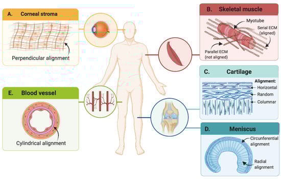 Examples of hierarchical cellular organization and ECM architecture in different native tissues. (A) Corneal stroma, (B) skeletal tissue, (C) cartilage, (D) meniscus, and (E) blood vessels (Created with BioRender.com).
