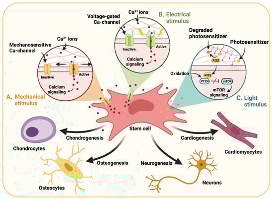 Schematic of the modulating effect of (A) mechanical, (B) electrical, and (C) light stimuli on the activation of specific signaling pathways that direct differentiation profiles of stem cells. Specific stimulation regimes that mimic mechanotransductional or electrical cues in embryonic development can activate calcium signaling. Similarly, ROS production upon light stimulation can promote the oxidation of PTEN, a strong inhibitor of mTOR, and thus upregulate mTOR signaling []. (Created with BioRender.com).