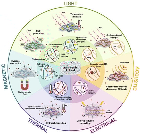 Hydrogels have been widely implemented for the localized and controlled delivery of therapeutics due to their versatility and high biocompatibility. Several design parameters such as pore size, backbone charge, hydrophilicity, and crosslinking density, can be strategically tuned to modulate the solubility/dispersibility of hydrophobic and hydrophilic molecules within hydrogels []. Moreover, their release profiles can be precisely controlled with specific changes in hydrogel structure induced by swelling, dissolution, or degradation, as a consequence of exposure to external stimuli (e.g., light, ultrasound, and electric and magnetic fields) []. The strategic design of drug-loaded hydrogels has therefore been directed towards the inclusion of stimuli-responsive molecules (e.g., polymers, proteins and peptides) or nanostructured materials (e.g., iron oxide, gold nanoparticles, carbon nanotubes, graphene oxide, and reduced graphene oxide) that respond to individual or combined stimuli []. Recent approaches that have employed external stimuli for controlling drug release profiles in rationally designed dECM-derived hydrogels are discussed below and summarized in Figure 5.