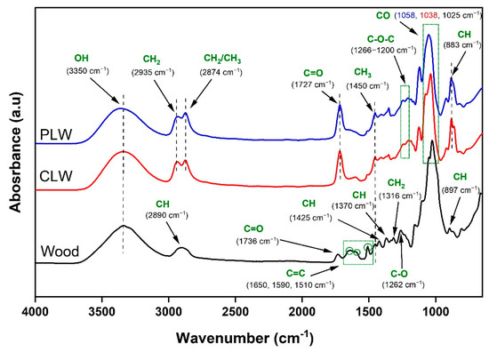 The FTIR spectra of spruce wood sawdust and the derived bio-polyols after liquefaction are presented in Figure 2. Wood, as a natural polymeric material, is composed of carbonyl, hydroxyl, ester, and ethyl linkages along with carbon–hydrogen bonds [63]. The stretching bands at 3350 cm−1 and 2890 cm−1 were respectively associated with the OH and CH bonds in cellulose, hemicelluloses, and lignin. A vibration at 1736 cm−1 corresponded to C=O stretching in unconjugated ketones, aldehydes, and carboxyl in xylan and hemicelluloses [63,64]. The broad band between 1650 cm−1 and 1590 cm−1, and the peak at 1510 cm−1, represented the C=C stretching of the aromatic ring in lignin [65]. Lignin bands were also found at 1450 cm−1 for asymmetric CH3 bending in methoxyl groups in lignin structure, 1425 cm−1 for aromatic skeletal vibration with in-plane CH deformation, and 1262 cm−1 resulting from syringyl ring breathing and C-O stretching in lignin and hemicelluloses [64,65,66]. The peaks specifically assigned to cellulose were at 1370 cm−1 for CH deformation, 1316 cm−1 for CH2 bending, 1025 cm−1 for C-O stretching, and 897 cm−1 for symmetric CH stretching vibration [67,68,69]. The chemical structure of CLW and PLW were similar but apparently different from that of raw wood sawdust. The absorbance band at 3350 cm−1 corresponding to OH groups were observed in both polyols. Two intensive peaks were observed at 2935 cm−1 and 2874 cm−1, which corresponded to CH2 and CH3 stretching. These, together with the disappeared peaks at 1650 cm−1, 1590 cm−1, and 1510 cm−1 in the spectra of CLW and PLW, compared to raw wood, confirmed the fragmentation of the chemical components of wood [70,71]. The carbonyl peak at 1736 cm−1 in the wood sawdust was shifted to 1727 cm−1 in CLW and PLW, which was attributed to the hydrolysis of cellulose and possible formation of levulinic acid and carboxylic acid, and also to the characteristics of aldehydes, ketones, and ester groups [72,73,74]. A bending vibration between 1266 and 1200 cm−1 was characteristic of the C-O-C groups of the ether bonds that originated from lignin [75,76]. The C-O bond stretching vibration was shifted from 1025 cm−1 in wood sawdust to 1038 cm−1 in CLW and to 1058 cm−1 in PLW. This is mainly associated with the cleavage of the glucoside bonds in the cellulose and the formation of new alcohol-glycoside [44]. The FTIR spectra confirmed that the chemical structure of wood sawdust was changed considerably under the liquefaction process and the obtained polyols contained a great number of hydroxyl groups appropriate for producing PU. In addition, the purification process did not cause changes to the chemical structure of bio-polyol.