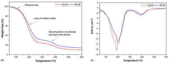 The thermal degradation behavior of CLW and PLW was studied by thermogravimetric (TG) and derivative thermogravimetric (DTG) analysis (Figure 3a,b). The weight changes of CLW and PLW at elevated temperatures are shown in Figure 3a,b illustrates the slope of the TG curve, which indicates the decomposition temperatures of the polymers. Both CLW and PLW went through two different stages. The first stage occurred between 100 and 300 °C due to the evaporation of water and low-molecular-weight compounds, and the defragmentation and degradation of the liquefied products [77]. The second stage took place at around 300–450 °C, where the liquefied products introduced by lignin and cellulose underwent further thermal decomposition [77]. Two main degradation peaks were observed for CLW and PLW, as shown in Table 4. The first temperature at which maximum weight loss (Tmax1) occurred was 189 °C for CLW and 200 °C for PLW, and the second maximum decomposition temperature (Tmax2) at 396 °C was for CLW and 391°C for PLW. The total weight loss of CLW was approximately 4.5% more than that of PLW, indicating a removal of water and alcohol during the purification process.