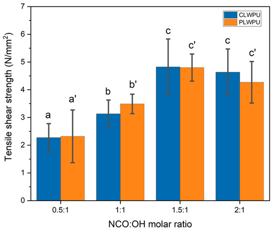 Tensile shear strength of wood samples glued with PU adhesives prepared from CLW or PLW polyols. The statistical differences between mean values at a 95% confidence interval (p < 0.05) are indicated by different letters and were assessed by using one-way ANOVA and Tukey’s significant difference test.