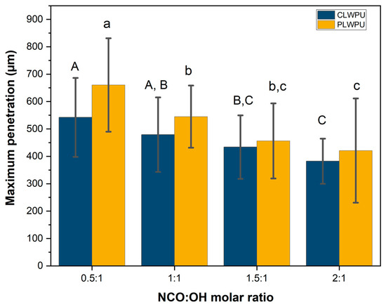Maximum penetration of CLWPU and PLWPU adhesives in beech wood assemblies. The statistical differences between mean values at a 95% confidence interval (p < 0.05) are indicated by different letters and were assessed by using one-way ANOVA and Tukey’s significant difference test.