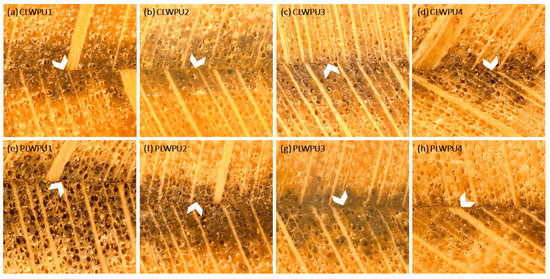 Light microscopy images of adhesive penetration: (a–d) LWPU1-4 was made with a NCO/OH ratio from 0.5:1 to 2:1; (e–h) PLWPU1-4 was made with a NCO/OH ratio from 0.5:1 to 2:1. Arrow heads are showing the bondlines.