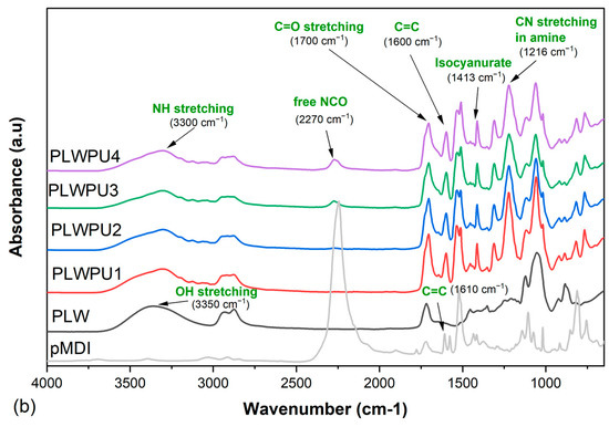 Figure 7 shows the FTIR spectra for the cured CLWPU and PLWPU adhesives at various NCO:OH molar ratios. The absorption band at 3330 cm−1, corresponding to NH stretching and the peak at 1700 cm−1 attributed to the C=O stretching, indicated the reaction between bio-polyols and pMDI to form urethane linkages [30,80]. The peak at 2270 cm−1 was associated with free NCO groups at the end of the PU polymer chain and in the neat pMDI. The absorption of this peak decreased obviously in the cured adhesives compared to neat pMDI, which indicates that most of the free NCO groups were consumed. However, this peak appeared with a higher intensity in PU, with a higher NCO:OH molar ratio for both CLWPU and PLWPU. The adhesive formulations with CLW polyol showed a greater free NCO band vibration than the ones with PLW. This interesting finding proved the previous assumption of higher reactivity of the OH groups in the PLW than the CLW, which means that the reactivity of OH groups was improved by the purification procedure. This might be due to the removal of secondary OH groups with a relatively low reactivity from CLW [27,81]. The peaks observed at 1600 cm−1 for CLWPU and PLWPU, and the peak at 1610 cm−1 for neat pMDI, were associated with the conjugated double bonds in the aromatic ring of the hard segment originated from pMDI [46]. In addition to the reaction between polyols and isocyanates, two further reactions may also have occurred: (a) reaction between pMDI and water molecules from the atmosphere to form amine groups by releasing CO2 gas, which was attributed to the peak of 1216 cm−1, and (b) reaction within the isocyanate groups to form isocyanurate, i.e., the peak at 1413 cm−1 [6,82,83]. The formation of amine groups decreased by increasing the NCO:OH molar ratios. This was noticeable even during the adhesive preparation by the considerable release of CO2 gas at a lower NCO:OH molar ratio.