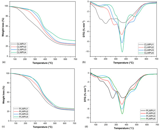 Mass loss of CLWPU1−4 (a) and PLWPU1−4 (c); first derivative of CLWPU1−4 (b) and PLWPU1−4 (d).