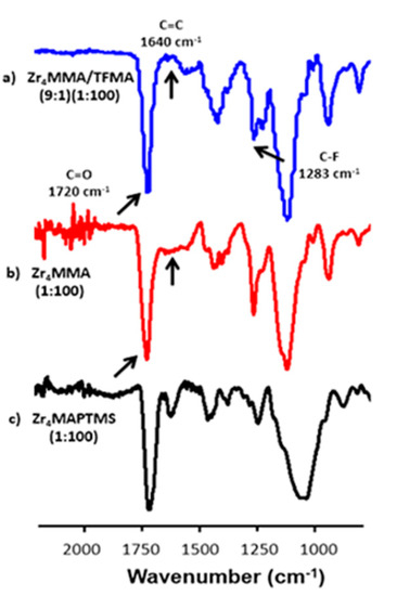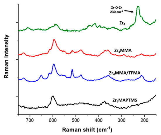 In Figure S1, the peaks around 3000–2900 cm−1 of the MMA and TFMA-based samples are due to aliphatic C-H stretching [14]. The bands at 1463 cm−1and 1426 cm−1 are related to the bending of CH3 and the band at 1194 cm−1 corresponds to the asymmetric stretching of C–O–C [20]. Another meaningful signal is the peak around 1283 cm−1, related to the stretching of C-F bond, characteristic of TFMA-based copolymers [28]. The band related to C=C double bonds belonging to the oxocluster (as well as to the monomer) is found at 1640 cm−1. The Zr4MMA/TFMA samples show a negligible intensity of C=C signal in every sample. The very low C=C/C=O intensity ratio demonstrates a nearly complete radical polymerisation, even better than Zr4MMA/MMA, despite the steric hindrance of the oxocluster. Concerning the hybrid with MAPTMS (Figure S1 and Figure 2c), it is possible to observe a very broad band around 3460 cm−1, ascribed to the vibration of surface bound water molecules and to the silanol groups (which also give the band at 1640 cm−1) [29], thus highlighting a not completely condensed silica network [30,31]. The relatively weak absorption bands around 2945 cm−1 and 2840 cm−1 are attributed to the stretching of C–H bonds in alkyl and methoxy groups, respectively. The bands at 1717 cm−1 and 1638 cm−1 were assigned to the stretching of C=O and C=C groups, respectively; the one related to C=C shows a higher intensity with respect to the other polymers, revealing a less efficient radical polymerisation for this material. The broad band centred at 1080 cm−1 and the weaker band at 780 cm−1 confirm the presence of a Si–O–Si network, with its asymmetric and symmetric stretching, respectively [32]. Subsequently, in order to investigate the presence of the oxocluster in the synthesised hybrids, Raman measurements were carried out, since the stretching vibrations of Zr–O–Zr appear at low wavenumbers (<250 cm−1) and cannot be detected using conventional FTIR [15,33,34]. In Figure 3, the superimposition of the Raman spectra of the oxocluster and of the hybrid materials is reported.