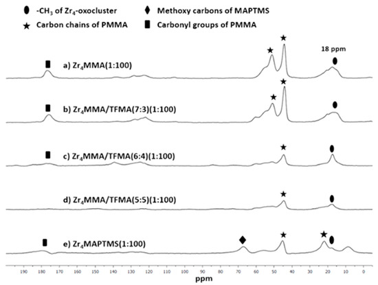 The signal at about 18 ppm is referred to the methyl groups belonging to Zr4 oxocluster and to MMA [14,39]; the signal at 23 ppm, for the Zr4MAPTMS(1:100) hybrid, and the peaks at 45 ppm and at 55 ppm, the latter being only present in the Zr4MMA (1:100) and Zr4MMA/TFMA (7:3) (1:100) hybrids, are related to the main chains of the MMA-[40] and the MAPTMS-[41] based polymers. The broad signal at 68 ppm of the Zr4MAPTMS (1:100) hybrid is related to the methoxy carbon atoms of the silane [41]. The carbonyl group of MMA is visible at 178 ppm [39], while the weak signals between 120 and 140 ppm are assigned to residual unreacted olefinic carbon atoms.