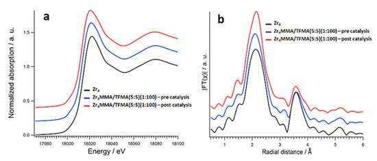 In the sample 1:50, indeed, the shoulder at 18029 eV increases in intensity, while in the sample 1:100 the splitting becomes clear, accompanied by a sensible decrease in the white line intensity (Figure S7). Owing to the lower degree of polymerization and to the swelling properties of this material, the oxocluster is likely exposed to degradation processes to a higher extent. The fluorinated sample Zr4MMA/TFMA (5:5) (1:100) demonstrates, instead, excellent stability, since also after catalysis the spectrum are consistent with an integral Zr4 oxocluster structure (Figure 6a). This is also confirmed by comparison of the Fourier transforms of the extended X-ray absorption fine structure (EXAFS) curves (Figure 6b). These fluorinated samples, recovered after catalysis, still present an evident second coordination shell at about 3.53 Å, representing the Zr–Zr distance.