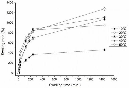 Swelling kinetics under different conditions of immersed medium was evaluated herein by measuring the water uptake at certain intervals, at pH 2–10, the ionic strength of 0.001–1.0 M NaCl and temperatures of 10–50 °C, so as to determine the effects of such external stimuli on the swelling behavior of the hydrogel samples. Variations in the swelling behavior of hydrogel H5CA are given in Figure 1, Figure 2 and Figure 3. The results reveal that a relationship exists between the temperature and the swelling capacity. As Figure 1 shows, the greatest capacity is evident at higher temperatures, possibly caused by thermal expansion of the hydrogel network and destruction of hydrogen bonding between the polymer molecules; such actions leading to the expansion of the hydrogel matrix after diffusion of the water into the porous structure of the hydrogel [23]. In contrast, the least extent of water uptake was observed when the immersed distilled water was at a low temperature (10 °C); this occurred as a consequence of minimal internal energy and entropy, in turn, leading to limited movement and reduced diffusion of the solution into the internal structure of the hydrogel [24].