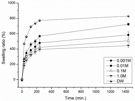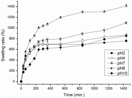 The values for SR of the hydrogels were measured in triplicate via the gravimetric method in solutions of different pH (pH 2–10), ionic strength (0.001–1.0 M NaCl) and temperature of the media (10–50 °C). In brief, 3 g of the dried hydrogel was soaked in distilled water for 24 h in the laboratory. The pH of the solutions was adjusted by 1.0 M NaOH and 0.1 M HCl to obtain the given range of pH. The kinetics of swelling were measured by taking the hydrogel out of the solution at defined intervals of time (5, 10, 15, 20, 30, 60, 180, 240 and 1440 min), then excess media was removed with filter paper and the weight recorded. The SR was determined by weighing the samples before and after immersion in distilled water for 24 h using the following Equation (2):