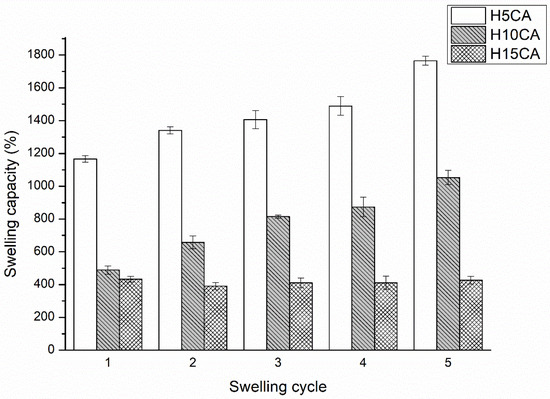 Another observation was that H5CA and H10CA exhibited reversible swelling behavior, with a rise in the swelling capacity during five swelling–drying cycles. This re-swelling ability significantly outperforms that of any cellulosic superabsorbent material reported in the literature [36,37,38], which has shown a rather declining trend with each cycle of swelling–deswelling.