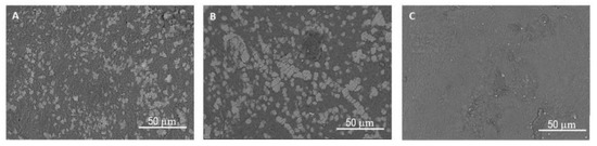 SEM micrographs of the surface of the dried hydrogels with the CA cross-linking agent at the concentrations of (A) 5% w/w; (B) 10% w/w and (C) 15% w/w.