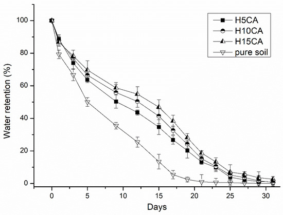 Assessing the capacity for water retention in soil is important for understanding of the potential of the hydrogel as a soil conditioner. The graph in Figure 7 shows a continuous decrease in such capacity in soil and loss of water over the course of a month. Water content in the soil, monitored over several days following the first irrigation, was significantly affected by the presence of the hydrogel. The soil samples containing hydrogel possessed substantially more humidity, which confirms their capacity for water uptake. The soil with hydrogel H15CA demonstrated a higher level of water retention exceeding that of pure soil by almost 30%. As the humidity in the soil decreased, the water absorbed by the hydrogel was slowly released, through a mechanism of diffusion [12]. Consequently, agricultural land with soil containing the hydrogel could possess more moisture during periods following irrigation or rain than otherwise, since water would be gradually released from the added material at any times of subsequent dryness [12,39].