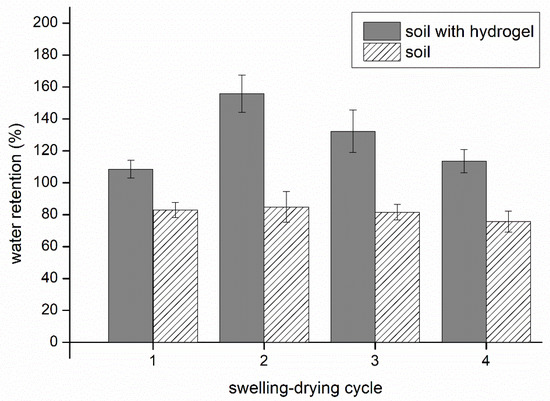 The number of swelling–drying cycles carried out provided information on how reusable the hydrogel was in soil (Figure 8). The samples were gauged for swelling capacity in soil four times; this required that the moist soil was dried to constant weight after each swelling cycle. Each cycle was performed under identical conditions. The results show that the soil amended by the hydrogel was able to repeatedly absorb and retain water after each instance of drying. Adding hydrogel H15CA into the soil resulted in a rise in the absorption capacity compared to pure soil, although variations were observed in water retention values for each swelling–drying cycle. The greatest level of water retention occurred in the second cycle, followed by a gradual drop in the third and fourth. This decrease in the water absorption capacity might have been caused by the hydrogel experiencing degradation and/or variation in its inner structure, as well as change in particle size and ionic osmotic pressure [31]. It should be noted that the swelling degree of the hydrogel could be lower in soil than any values discerned for swelling in distilled water. Since each hydrogel particle in the soil was surrounded by particles of soil under limited pressure from the given environment, water uptake was somewhat diminished.