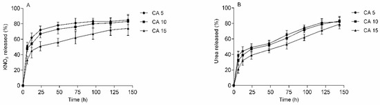 Simultaneous release of potassium nitrate and urea from (A) H5CA, (B) H10CA and (C) H15CA; as performed in distilled water at room temperature; data refer to mean values ± SD (n = 3).
