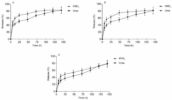 No statistical difference existed between the simultaneous release profiles detailed in Figure 10 (p < 0.05), suggesting the components neither interacted with each other, e.g., chemically, nor was there any effect on the release or the interaction with the hydrogel matrix. No alterations in the polysaccharide-KNO3 or polysaccharide-urea were observed either, due to the simultaneous presence of the fertilizers.