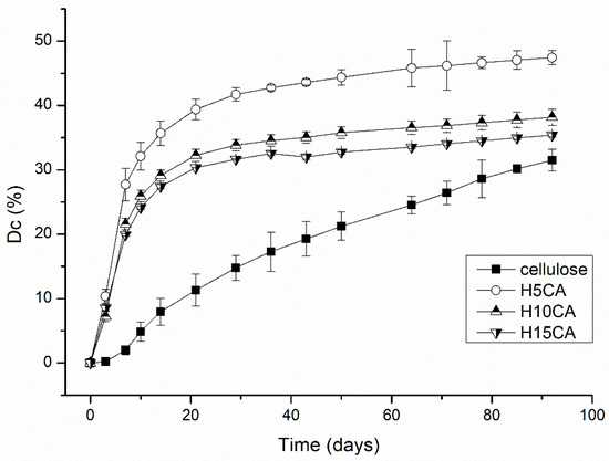 Mineralization curves for the various cross-linked samples, including reference material (cellulose).