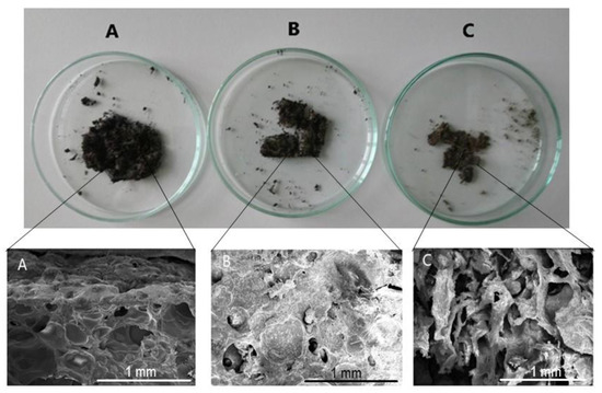 Visual degradation and SEM micrographs of hydrogel H15CA after (A) 5 days, (B) 10 days and (C) 20 days in soil, respectively.