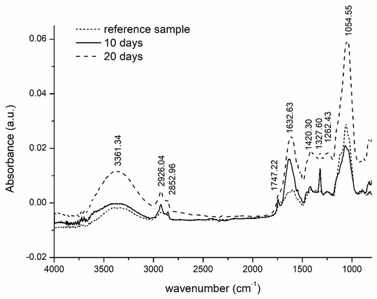 The intensity of some peaks for the degraded hydrogel were seen to be lower than those described above, and some had shifted to a different region of the wave number during biodegradation. For example, such a decrease in intensity is evident in the region of 1747 cm−1, an expression of ester groups formed by the occurrence of cross-linking with the citric acid. As the samples degrade, the strength of their carboxyl bonds diminishes. The ATR-FTIR spectrum for the hydrogel residues show peaks at 2852, 2400, 2300, 1747 and 1327 cm−1, which are reduced in intensity and potentially indicate the loss of functional groups through the microbial breakdown of the samples. It is probable that during biodegradation these cross-linking bonds were the most easily accessible to the enzymes secreted by the microbes, hence they were broken at the beginning of the degradation process. The FTIR spectra also show peaks related to the degradation of cellulose. For example, a new sharp peak at 1547 cm−1 is attributed to the presence of free -COOH groups [17], while 1420 cm−1 pertains to the stretching vibration of COO and is an indication of the carboxyl groups of CMCNa. The peak at 1262 cm−1 denotes the stretching vibration of a new C-C bond from components of the reacted CA and cellulose derivatives. Lastly, a sharp peak appears at 1054 cm−1 that is characteristic of the bending vibration of the -OH group.