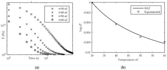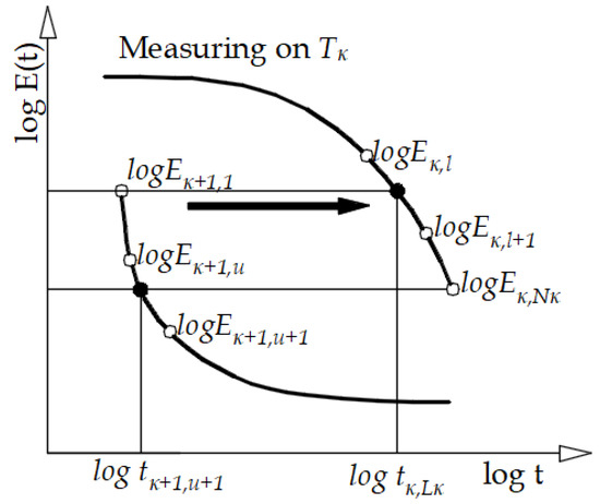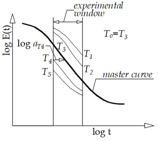 To construct a master curve at the selected temperature Tκ, it is necessary to move all segments measured at Tj > Tκ to the right, and the remaining segments, measured at Tj < Tκ to the left along the logarithmic time axis, so as to obtain a “smooth” main curve, as shown in the schematic in Figure 2. The individual horizontal displacements, log a (Tj, j ≠ κ) obtained in this process, represent a set of discrete values describing the so-called time-temperature superposition, which is usually modeled with the WLF expression.