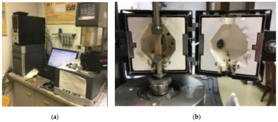 The rheometer (Figure 3) “ARES-G2 TA instruments” was used in the research for dynamic mechanical analysis of samples. The specimens (Figure 4) were attached to the torsional rectangular fixture and the torsional sinusoidal load. The test procedure was controlled by computer Trios software. The amplitude test with oscillating amplitude was performed at 1 Hz with a stress increase of 1.0 × 10−6 to the end of the linear viscoelastic region of the material, which was determined by a sudden change (more than 5%) of the storage modulus. The tests were performed at a constant temperature of 30 °C. The storage modulus, loss modulus, and tan δ are calculated from the material response measurements.