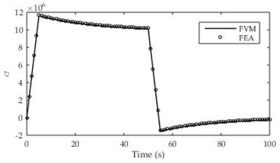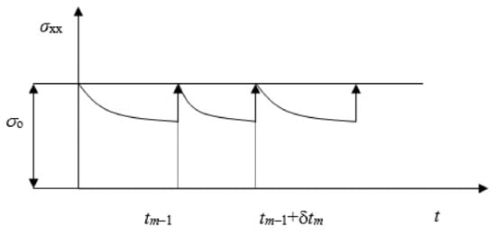 Figure 5 shows the stress relaxation in the case of uniaxial load, when a constant stress σo is given at the limit. If f2(tm) is the total force at time tm, and df2(tm) is the increment of the force in the m−th time and/or incremental step (Figure 5), then, using the expression for total stress [15], it holds that:
