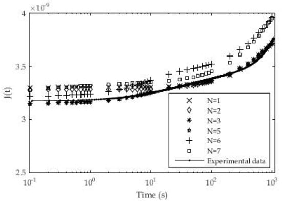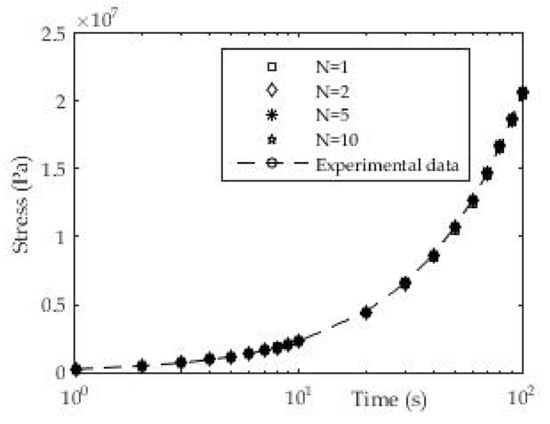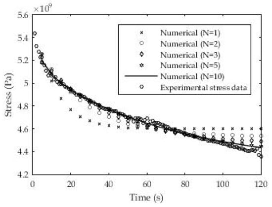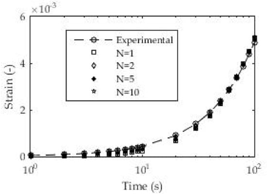 For this test, we selected the same 3D printed polymeric material (PLA) with samples printed in three-layer thicknesses. The aim of this test is to determine the creep modulus or more precisely to determine the coefficients in the Prony series for the creep modulus during the test time. For this test, the number of exponential terms in the Prony series was taken from n = 1, 2, 5, and 10 with the relaxation times based on previous experiments and the linear distributions over several decades. The assumption of known relaxation times is based on previous similar research, and the approach used in this study is more convenient due to the reduction in the number of unknowns and equations in the system of nonlinear equations, as a consequence of the application of nonlinear regression.