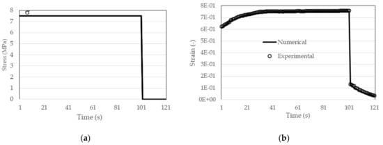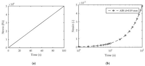 Figure 8 shows the method of loading 3D printed samples of polymeric material and the linear stress ratio over time. The dimensions and geometry of the samples are identical to those in Section 3.1.1. Figure 8b shows the experimental results for deformation over time as a consequence of the applied load for one layer (d = 0.19 mm) of the 3D printed samples. All results in the form of certain coefficients were obtained using the appropriate Equation (5) in relation to the experimental results.
