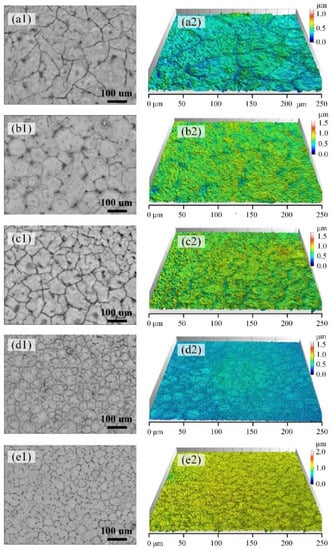 Morphology images of PLLA samples after crystallization treatment at a temperature of 80 °C: (a1–e1) show the microscopy images of PLLA1, PLLA2, PLLA3, PLLA4 and PLLA5, respectively. The three-dimensional images of (a1–e1) were obtained by CLSM and are shown in (a2–e2), respectively.