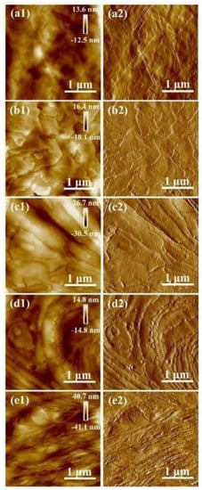 AFM images of the crystal surface of PLLA samples after crystallization treatment at a temperature of 80 °C: (a1–e1) show the height images of PLLA1, PLLA2, PLLA3, PLLA4 and PLLA5, respectively; (a2–e2) show the peak force error images of the five PLLA samples, respectively.