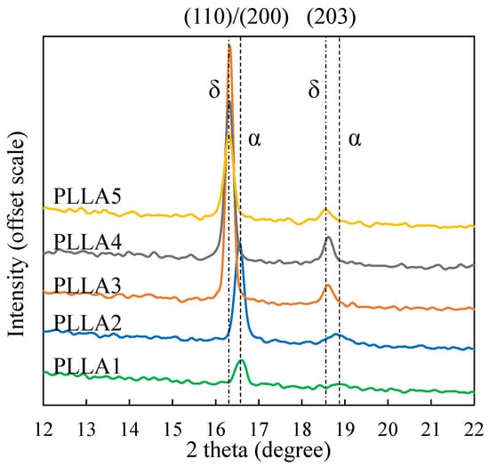 This section will further investigate the crystal structure differences of the five PLLA samples. Figure 3 gives the WAXD diffraction profiles of the five PLLA samples after crystallization treatment at a temperature of 80 °C. In Figure 3, there are two kinds of curves. The curves of the PLLA3, PLLA4 and PLLA5 samples basically match that of the PLLA δ form [6,7,8], and the peaks are mainly found at 2θ ≈ 16.3° and 18.6°. According to Zhang et al. [7,16] and Pan et al. [19,20], the disordered α form (δ form) of PLLA is commonly acquired at a crystallization temperature below 120 °C. The crystallization temperature of PLLA5 was 80 °C, which conforms to the formation condition of the δ form. The curves of the PLLA1 and PLLA2 samples basically match that of the PLLA α form, whose dominant peak (110/200 reflection) is located at 2θ ≈ 16.7°, and the secondary peak (203 reflection) is located at 2θ ≈ 18.9°. Here, α crystals are formed at 80 °C from PLLA samples with molecular weights of 1700 and 5500 g/mol. This result means that the crystallization temperature condition (<120 °C) is not the only necessary condition to form PLLA δ crystals, and that changing molecular weight can also induce α/δ crystal form transition.