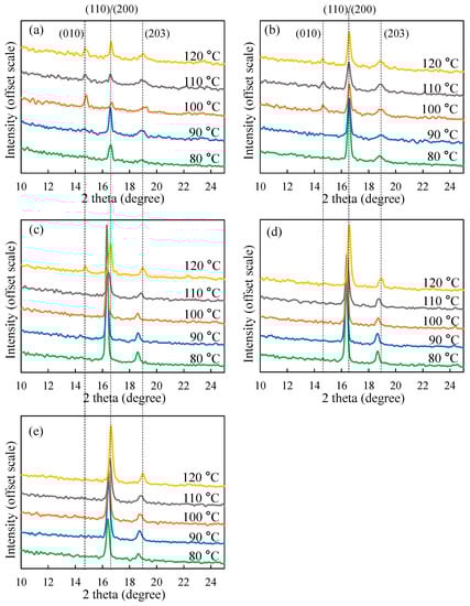 Figure 4 shows the WAXD curves of PLLA samples treated at five temperatures of 80 °C, 90 °C, 100 °C, 110 °C and 120 °C. It can be seen from Figure 4 that the influence of temperature on the crystal form of PLLA is also obvious. From Figure 4a,b, with the increase of temperature, the location of dominant peaks representing the 110/200 reflection remain unchanged, and the peaks representing the 010 reflection become more and more obvious. As shown in Figure 4c–e, with the increase of temperature, the 2θ of dominant peaks representing the 110/200 reflection of PLLA3-PLLA5 samples shifts to a higher value. The higher 2θ value of the WAXD peaks at this location indicates the α/δ crystal form transition of the PLLA crystal. In this way, increasing crystallization temperature can cause the crystal form to change from δ to α when the molecular weight is larger than that of PLLA3 (≈10,800 g/mol). For the PLLA1 and PLLA2 sample, only α crystals are found in the temperature range of 80–120 °C. Furthermore, the FTIR results given by Figure S5 in the Supplementary Materials also support the judgment about α and δ crystals based on the previous studies [26,27,28,29]. Next, we will further study the calorimetric properties of these two kinds of crystal forms by DSC.