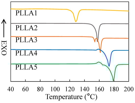 The number-average molecular weight and polydispersity of the purified samples were determined by gel permeation chromatography. The specific rotation value [α] was measured by using a spectropolarimeter. The glass transition temperature and melting point were measured by using a differential scanning calorimeter. The molecular weight, thermal properties, and specific rotation degree of five PLLA samples are listed in Table 1, and the original data of the material properties is given in Figures S1–S3 of the Supplementary Materials.