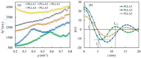 where is the direction normal to the lamellar interface. Figure 6b shows the calculation results of the one-dimensional correlation function of the PLLA1, PLLA2 and PLLA3 samples. Because PLLA4 and PLLA5 have no obvious scattering peak within 0.2–0.8 nm−1 of the scattering vector q, the corresponding one-dimensional correlation function cannot be given. The correlation function long period can be obtained by locating the first maximum in the one-dimensional correlation function [31,32]. The crystal thickness () is given by the intersection between the straight line extended from the self-correlation triangle and the baseline in the one-dimensional correlation function [33], as shown as Figure 6b. The amorphous layer thickness () is then given by . Moreover, there is a transition region between the crystalline region and the amorphous region. Based on Strobl’s theory [34], the transition region thickness () can be given by the horizontal length of the curved portion of the hypotenuse of the autocorrelation triangle, as shown as Figure 6b. According to the above calculation methods, Table 2 lists the SAXS data analysis results of the PLLA1, PLLA2, and PLLA3 samples.