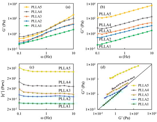 The dynamic frequency scanning curves of five PLLA samples at 190 °C: (a) storage modulus G′ vs. frequency ω; (b) loss modulus G″ vs. frequency ω; (c) complex viscosity vs. frequency ω; (d) storage modulus G′ vs. loss modulus G″.