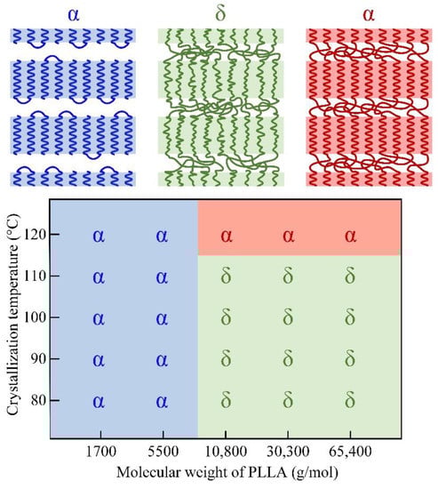 Based on the above results and discussions, Figure 8 shows a diagram of α/δ crystal forms of PLLA with different molecular weights and different crystallization temperatures. In the view of this research, the low molecular mobility at low temperature and the crowding effect caused by retained entanglements or other amorphous chains are the formation reasons for δ crystals. When the temperature is relatively high, e.g., 120 °C for PLLA with large molecular weights, the crowding effect will also be serious in the amorphous region. However, a molecular chain with high mobility can still form ordered α crystals during the crystallization process. Moreover, when the PLLA sample with δ crystal is heated to a temperature of 120 °C, as shown as Figure 4, δ crystals can be transformed into α crystal without disentanglement, which is a kind of solid–solid phase transition [16,17,18].
