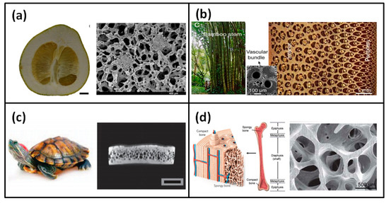 Cellular medium materials in nature (a) grapefruit peel, (b) bamboo, (c) turtle shell, and (d) bone [2,18].