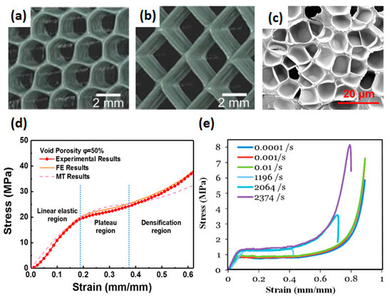 A cellular medium is a porous structure with a solid material (polymer/metal/ceramic) as the matrix and a large number of bubbles. It is a very common material in nature, especially in the biological field. Cellular media provide a variety of protective measures and structures for organisms, and have high specific strength (e.g., turtle shells and wood) [1,2,3,4,5,6,7]. Inspired by nature, researchers began to have a strong interest in the study of the diversity and mechanical properties of porous media, and began to design and analyze the mechanical behavior of different porous media materials and structures. Cellular media materials have been widely used in packaging boxes, transportation, for daily necessities, industrial manufacturing, national defense, military industries, and in biomechanical research (substrate material of elastic matrix sensor) [8], due to their many advantages including their efficient heat and sound insulation, good compression, mechanical properties and ductility, and low cost [9,10,11,12,13,14].The mechanical properties of a cellular medium are determined by both matrix and cell structure. Investigating the constitutive relationship between these can help us better understand the mechanical properties of a material and have an irreplaceable effect on the optimization of its properties [15,16,17].