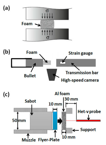 Schematic diagram of (a) quasi-static loading, (~100 s−1) [32], (b) dynamic impact test (101–105 s−1) [33], and (c) flyer-plate impact test (~106 s−1) [34].