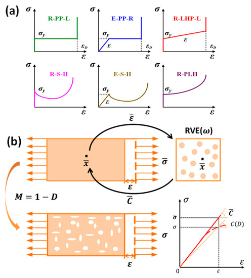 The homogenization model is only available when the matrix phase and the inclusion phase are both isothermal linear elastic materials. However, a cellular medium is not just a linear elastic material. To study the plasticity of material, it is necessary to adopt a progressive damage model. The progressive damage model of composite material belongs to the category of continuum damage mechanism. Different from the damage model that studies the evolution of a single macroscopic crack inside a composite material, the progressive damage model introduces damage variables to express the microdefects in the entire material [105,106,107,108]. These micro-defects can be considered to be continuously distributed inside the material. They will cause the actual internal stress of the material to be higher than the characteristic stress obtained by external measurement. It can be expressed that the stiffness of the material with defects is lower than the stiffness of the non-damaged material, as shown in Figure 4b. Based on the Kachanov-Rabotnov theory, the damage variable D is introduced to describe the constitutive relationship of the damaged material. The one-dimensional characterization stress and the real stress (macro-stress) can be simplified as: