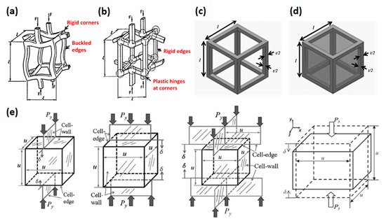 Deformation mechanism (a) elastic collapse and (b) plastic collapse [28], and single cell model (c) open-cell unit [109], (d) closed-cell unit [110], and (e) cell model under different uniaxial loadings [111].