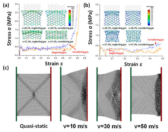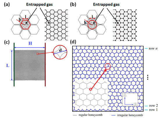 Some researchers [119,120,121,122,123,124] established 2D multi-cell models to investigate the mechanical properties of cellular media, as shown in Figure 7. Sun [120] thought that entrapped gas hardly affects plateau stress, but it did affect the deformation modes. In the densification region, the entrapped gas significantly enhanced crushing stress, as shown in Figure 8a,b. Generally, the effect of entrapped gas on the hexagonal cells is more important than that on the circular cells, indicating that it is dependent on the cell morphology.