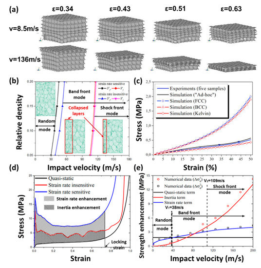 Ramachandra [45] used the pressure head test to find that the effect of energy absorption on closed-cell foams with a relative density of 8% at a velocity below 10 m/s basically did not change, but at a velocity above 10 m/s, its energy absorption effect increased significantly. Sun [46] proposed that the strain rate effect of cellular media was closely related to the matrix material and cell structure. Different microstructures of cellular media experience different deformation modes and stress and strain distributions during the compression. Bouix [47] investigated the stress-strain behavior of PP foams in the strain rate range of 0.01–1500 s−1 and found that low-porosity foams had strain rate hardening due to thicker cell walls, resulting in high yield stress. However, the high-porosity foams were not sensitive to strain rate hardening. Luong [31] found that the yield strength of PVC foam material increased with the increase of strain-rate, as shown in Figure 2e. Chen [48] found that when the strain-rate exceeded 113 s−1, the compressive strength of EPS foam increased rapidly with the increase of strain-rate, and the densification strain decreased slightly with the increase of strain-rate. In the strain-rate range of 1–280 s−1, Young’s modulus had no obvious strain rate dependence.